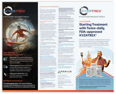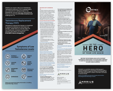 Print and display KYZATREX Patient Education Trifolds in your practice. This resource provides comprehensive information on low testosterone symptoms, treatment with KYZATREX, and critical safety information.