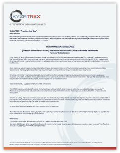 Our customizable KYZATREX Press Release Template provides a structured format to highlight your expertise in treating low testosterone and introduces KYZATREX as a new treatment option in your practice. Utilize this tool to enhance your practice's visibility and patient outreach.